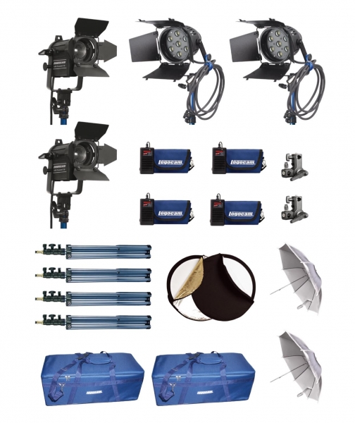 Автономный компактный комплект рисующего света Logocam A-LED 900 DIM KIT (56) оптимален для работы на выезде или в любом месте, где работа от сети нежелательна или невозможна. Состоит из двух компактных универсальных светодиодных светильников Logocam L-Spot 30 со световым потоком, эквивалентным мощности галогенного светильника 300 Вт и двух светодиодных прожекторов с линзой Френеля Logocam LED-Fresnel 20 со световым потоком, эквивалентным мощности галогенного светильника 150 Вт. Дополнительно комплект снабжен двумя отражающими зонтам и отражателем, что позволяет значительно расширить диапазон построения различных схем освещения. В качестве автономного источника электроэнергии используются 4 комплекта портативного электропитания PK1(X). Возможна работа от сети 220 В (источники питания идут в комплекте). Поставляется в транспортном кофре с водоотталкивающей пропиткой. Этот осветительный комплект может быть использован для решения любых осветительных задач. Время автономной работы составляет 1,5 – 2 часа. Масса комплекта 15 кг.