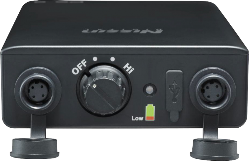 Nissin предусматривает возможность зарядки через USB- разъем, который обеспечивает постоянный ток в 5V 2A. Блок PS 8 может служить быстрым зарядным устройством в