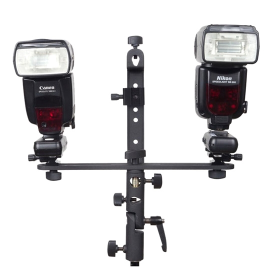 Держатель Phottix FT предназначен для установки двух импульсных вспышек. Держатель позволит зафиксировать головки вспышек в направлении центра зонта для достижения более мягкого света. Держатели для вспышек имеет длину 28см. Его легко можно разобрать и сложить в имеющийся в комплекте чехол. Нижняя часть имеет стандартное крепление 5/8'', а также крепление со внутренней резьбой ¼” и 3/8” для лёгкой установки держателя на осветительную стойку или штатив. |
