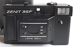 Фотоаппарат Зенит-35F – советская модель фотоаппаратов из категории простейших, то есть фотоаппаратов, обладающих минимально-необходимым набором функций для фотографирования. Эта модель производилась Ленинградским оптико-механическим объединением (ЛОМО) в 1987-1992 годах и была ориентирована на начинающих фотолюбителей. Корпус фотоаппарата Зенит-35F пластмассовый с открывающейся задней стенкой. Взвод затвора и одновременная перемотка плёнки производится полускрытой головкой. Фотоаппарат Зенит-35F снабжен встроенной фотовспышкой и экспонометрическим устройством, информирующий фотографа о необходимости использовать вспышку. Футляр для транспортировки камеры не требуется так как объектив при переноске закрывается металлическими шторками, одновременно происходит отключение питания и блокируется кнопка спуска.