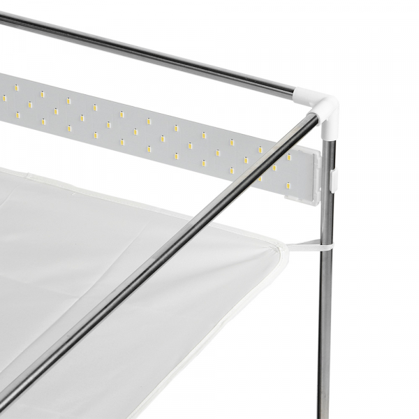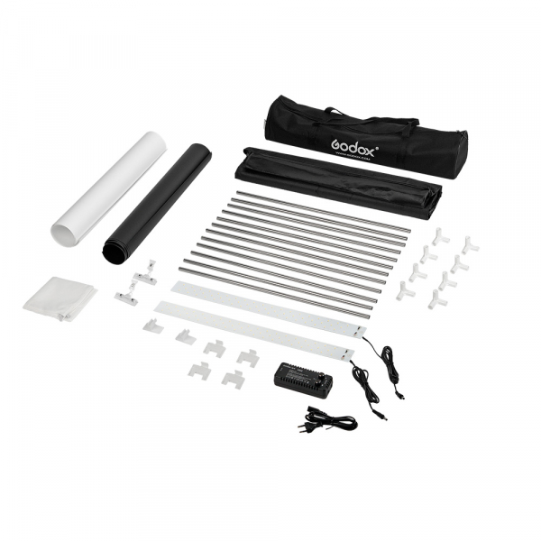 Фотобокс Godox LSD60 с LED подсветкой Конструкция фотобокса Фотобокс Godox LSD60 с LED подсветкой это готовая мини-студия для фотографирования небольших объектов, внутренний размер фотобокса 60×60×60 см. Используется в предметной съёмке: для печатных каталогов, интернет-магазинов и т. д. Компактность фотобокса в сложенном состоянии позволяет хранить его в любом шкафу. Также фотобокс отличается простотой сборки и разборки, использование инструмента для этого — исключено. Конструкция представляет собой трубчатый каркас с надетым на него кожухом с внутренними серебристыми отражающими поверхностями. На гранях кожуха фотобокса есть три отверстия закрытые клапанами на липучке. Два больших отверстия расположены на передней и верхней гранях фотобокса и предназначены для фотографирования объектов с разных ракурсов. Маленькое отверстие (на верхней грани) предназначено для заведения кабелей питания светодиодных линеек внутрь фотобокса. Фотографирование предметов также можно осуществлять полностью откинув переднюю грань фотобокса. Крепление светодиодных линеек производится за счёт пластиковых клипс (предусмотрены в комплекте) на верхние либо на вертикальные рёбра внутрь фотобокса (для крепления на вертикальные трубки и на горизонтальные предназначены разные клипсы). Для получения более рассеянного света, в комплекте предусмотрен тканевый светорассеиватель, фиксация которого осуществляется за счёт резиновых петель к трубчатому каркасу фотобокса. Для получения более качественного светотеневого рисунка — положение светорассеивателя можно регулировать по высоте. В комплекте предусмотрено два пластиковых полуматовых фона. Цвета фонов: чёрный и белый. Крепление фона к каркасу производится двумя комплектными прищепками. Освещение Освещение фотобокса осуществляется двумя мощными светодиодными линейками. С помощью кабеля со штекером, каждая линейка подключается к адаптеру питания Godox LSC2. Раздельная регулировка яркости линеек и их выключение производится за счёт двух диммеров, находящихся на корпусе адаптера питания. Суммарная мощность всех светодиодов составляет 40 Вт. Цветовая температура осветителей — 5800 К ± 200 К. Индекс цветопередачи CRI составляет более 96. Хранение и транспортировка Для хранения и транспортировки в комплекте предусмотрена мягкая нейлоновая сумка-чехол на молнии с ручками.