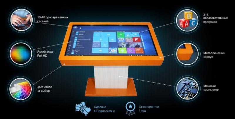 Интерактивный стол Project touch 50 создан в России, имеет металлический корпус без острых углов, специально для школ и других образовательных, и не только, учреждений. Диагональ дисплея составляет 125 см, такой большой размер позволяет нескольким пользователям, взаимодействовать со столом, не мешая друг другу. Интерактивный стол Project touch 50 имеет встроенный компьютер с установленным набором обучающих игр и акустику суммарной мощностью 20 Вт. Режим мультитач поддерживает 10 касаний одновременно. На боковой панели имеются два выхода USB 3.0.