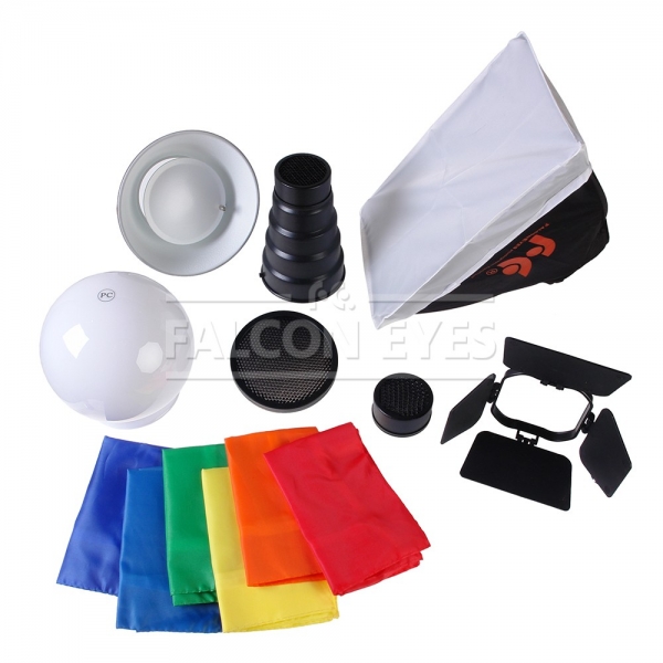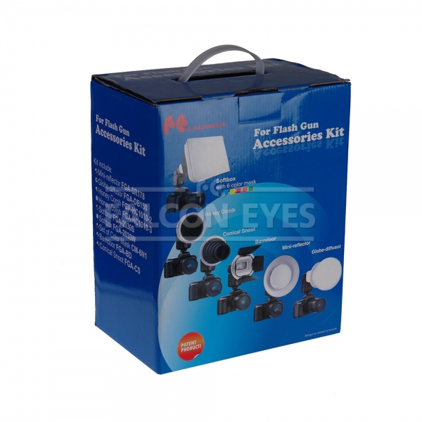 Falcon Eyes FGA-K7 — универсальный набор светоформирующих насадок. Комплект позволит фотографу, куда бы он ни поехал, иметь при себе весь необходимый студийный набор и дополнить вспышку оборудованием для создания всевозможных световых эффектов.