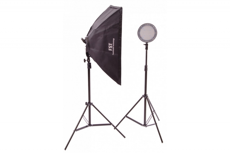 Комплект постоянного света FST LED-1682 Kit состоит из двух светодиодных осветителей FST LED-168 мощностью по 45 Вт, двух стоек высотой 2 метра и двух софтбоксов 50x70 см. |