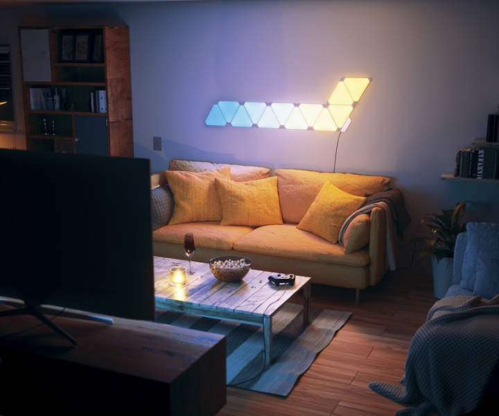 Нет идеи для подарка? Хочется обновить интерьер? Не можете выбрать ночник или лампу? Умная система освещения Nanoleaf Aurora станет отличным ответом на любой из подобных вопросов. Уникальный набор из 9 светодиодных RGBW панелей — это передовое решение в световом оформлении интерьера, которое вы ещё не видели! Nanoleaf Aurora украсят любую комнату и создадут неповторимую атмосферу, наполненную светом и яркостью 16.7 миллионов цветов. Светодиодные модульные панели выполнены в форме равносторонних треугольников со сторонами 21 см. Благодаря уникальному креплению можно соединять треугольные ячейки разными гранями и создавать причудливые геометрические фигуры. Цвет каждой панели Aurora подбирается в приложении Nanoleaf App. Там же вы можете выбрать яркость и контрастность свечения.
