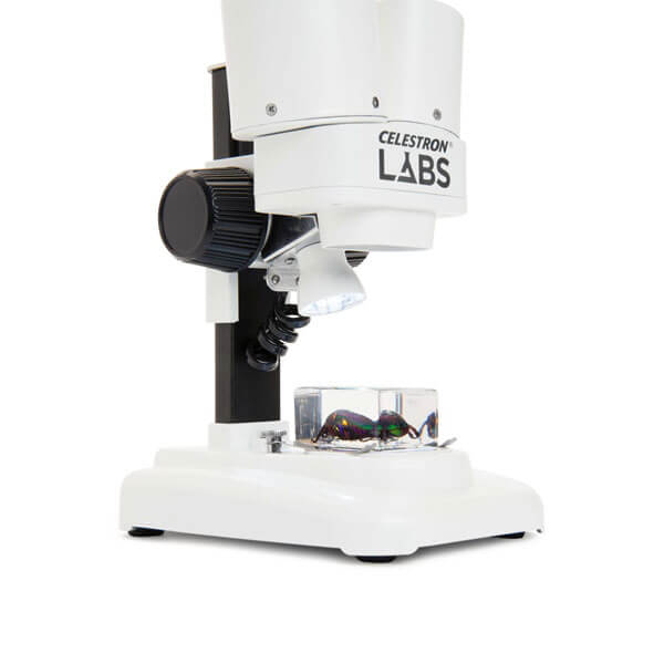 Микроскоп Celestron LABS S20 Стереомикроскоп Celestron Labs SB20 со встроенным верхним светодиодным осветителем, создает не плоское, а трехмерное изображение. Благодаря 20x увеличению он хорошо подходит для просмотра объемных деталей, таких как монеты, листья, насекомые, минералы и других средних и крупных объектов. Два широкоугольных окуляра (10x) и 2 ахроматических объектива позволяют получить увеличение 20х. При необходимости можно приобрести другие окуляры, что позволит изменять увеличение, как в большую, так и в меньшую сторону. Так же можно подключить цифровую камеру для микроскопа, для вывода и захвата видео изображения. Прочный корпус этого микроскопа оснащен ручками фокусировки, расположенными с обеих сторон микроскопа, обеспечивающие удобство фокусировки, что в сочетании с качественной стеклянной оптикой, гарантирует высокое качество изображения и длительный срок эксплуатации микроскопа. В комплект поставки включены 2 насекомых в акриле, позволяющие моментально погрузиться в захватывающий мир открытий. Предметная пластина микроскопа двухсторонняя, с одной стороны плоская поверхность, а с другой стороны выполнена в виде неглубокой чаши, она может использоваться, как для сыпучих так и для жидких объектов. Микроскоп может найти широкое применение в учебном процессе, как в школе, в колледже так и высших учебных заведениях. Работа подсветки от батарей позволяет использовать микроскоп на уроках, проводимых на улице.