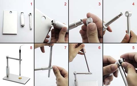 На кронштейне есть ручка, вращением которой можно плавно менять высоту установки микроскопа над подставкой и тем самым фокусировать изображение. Также подставка позволяет менять угол наклона микроскопа.