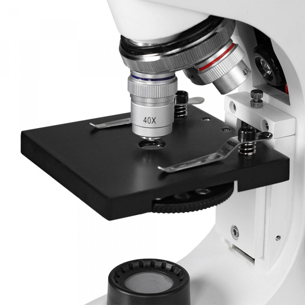 • Рукоятки грубой и тонкой фокусировки, расположенные по обеим сторонам штатива, обеспечивают точную настройку резкости изображения на большом увеличении. Рукоятки расположены на одной оси. Такая комфортная система фокусировки отличает этот микроскоп от других школьных моделей.