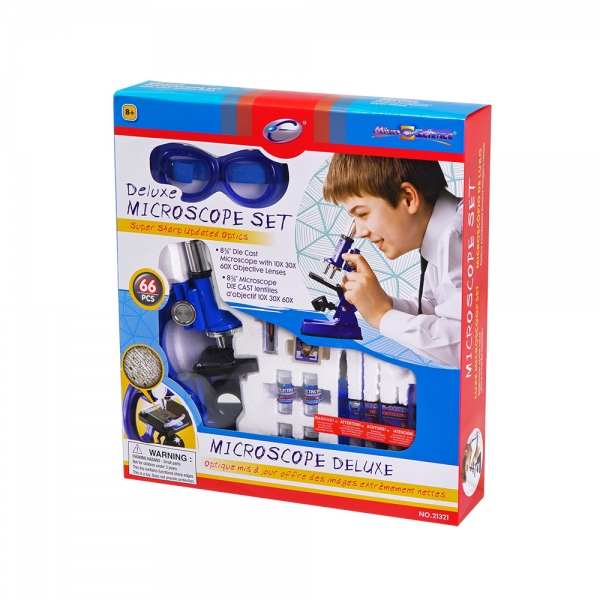 Отличный подарок для ребёнка, желающего погрузиться в увлекательный мир микробиологии. Микроскоп располагает осветителем с двойным действием – когда он повёрнут зеркалом вверх, освещение происходит путём солнечного света. Один поворот, и вот у вас уже освещение от лампы, встроенной в другую сторону осветителя (батарейки в комплект не входят). Это может быть полезно при пасмурной погоде или при отсутствии достаточного освещения в комнате. В комплекте к микроскопу идёт два предметных стекла с уже заранее подготовленным препаратом, и целых 10 предметных стёкол для приготовления своих микропрепаратов, с чистыми стикерами для маркировки. Прямо как в настоящей лаборатории!