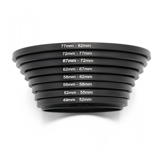 7 колец: 49-52мм, 52-55мм, 55-58мм, 58-62мм, 62-67мм, 67-72мм, 72-77мм |