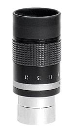 Фокусное расстояние этого окуляра изменяется в диапазоне 7–21 мм. Для максимального удобства настройки на корпусе имеется шкала с промежуточными значениями фокусного расстояния. Все оптические компоненты окуляра выполнены из высококачественного оптического стекла, на них нанесено многослойное просветляющее покрытие. Окуляр снабжен сдвижным резиновым наглазником для удобства использования, а большое удаление выходного зрачка позволяет вести наблюдения даже тем, кто постоянно носить очки.