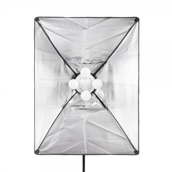 Корпус осветителя на 4 патрона стандарта Е27. На задней панели находятся два переключателя, каждый из которых управляет функцией включения/выключения для двух ламп, расположенных по периметру. Осветитель питается от сети 220 В и имеет стандартный разъем для установки на стойки с креплением 5/8". Осветитель можно использовать самостоятельно или вместе с софтбоксом 60х80 см из комплекта поставки.