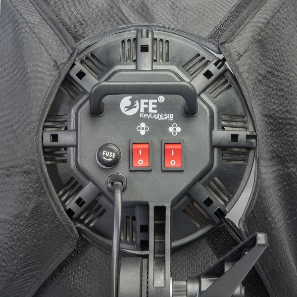 Осветитель оборудован 5 патронами стандарта Е27, в которые устанавливаются светодиодные лампы. На задней панели расположены два переключателя, каждый из которых управляет функцией включения/выключения для двух ламп расположенных по периметру, а центральная лампа включается общим переключателем, который находится на кабеле питания. Осветитель питается от сети 220 В и имеет стандартный разъем для установки на стойки с креплением 5/8". Осветитель можно использовать самостоятельно или вместе с софтбоксом 50х70 см из комплекта поставки.