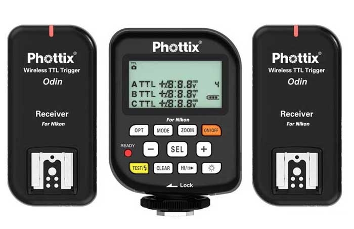Радиосинхронизатор вспышек Phottix Odin TTL для Nikon представляет собой передатчик, совмещенный с пультом управления, и двумя приемниками для совместимых вспышек. Он позволяет без использования кабелей «поджигать» TTL вспышки, сохраняя в полной мере функции TTL, а также на расстоянии контролировать мощность и фокусное расстояние вспышек. Взаимодействие осуществляется на частоте 2.4 ГГц на расстоянии более чем 100 метров. Устройство Phottix Odin TTL предлагает фотографам 4 радио канала и 3 контролируемые группы вспышек. Вспышки могут контролироваться в традиционных для Nikon режимах пропорции A:B с настройкой EV +/- в три шага. Уникальна возможность устанавливать группы в режиме TTL/смешанном. Отдельные группы (А, В, С) могут контролироваться в TTLрежиме при помощи регулирования EV +/-. Группы также могут быть настроены в ручном режиме с удалённой регуляцией настройки мощности, либо выкючены.