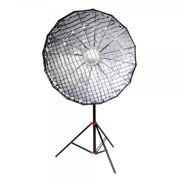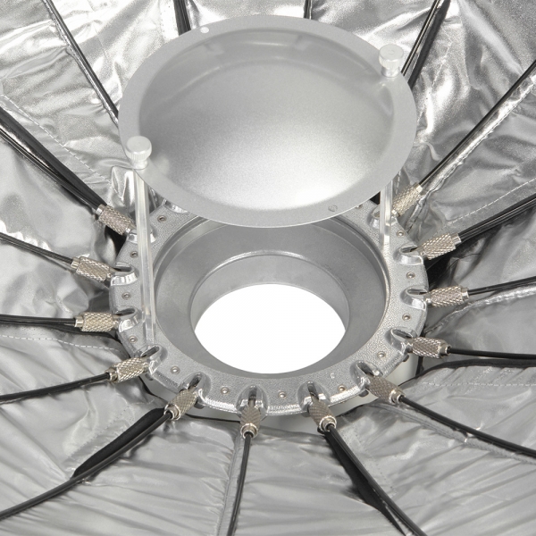 В комплект входит металлический дефлектор, тканевый внутренний рассеиватель с серебристой вставкой, внешний рассеиватель на липучке и сотовая насадка с ячейками 4х4 см. Тарелка быстро подготавливается к работе, сборка занимает несколько секунд – достаточно просто разложить спицы и установить необходимую насадку. Установленную на приборе тарелку можно поворачивать на 360 градусов, выбранное положение фиксируется винтом на основании с внешней стороны.