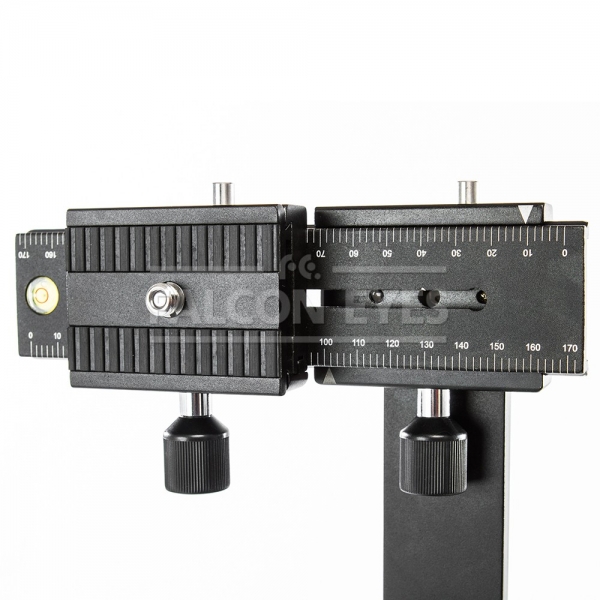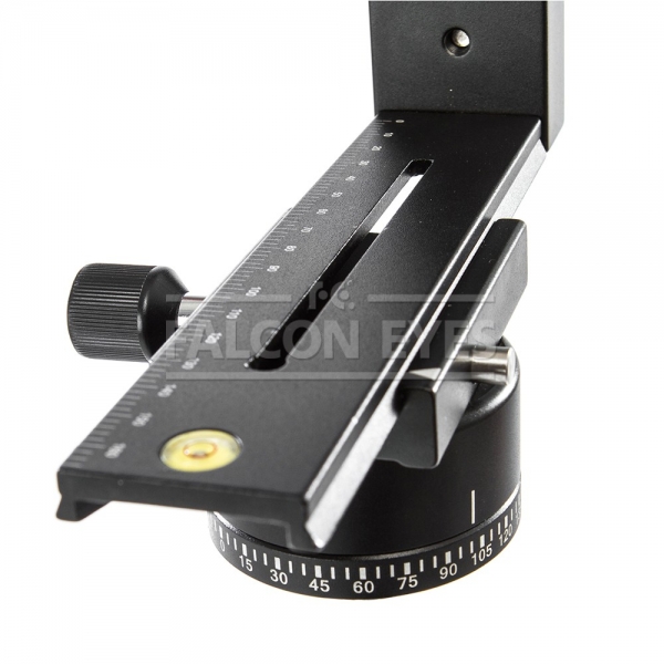 Кронштейн состоит из трех планок, две из которых жестко закрепляются между собой под углом 90˚ в рабочем положении и складываются для транспортировки, а третья, с узлом поворота камеры в вертикальной плоскости (наклон камеры), оборудована фиксатором положения с щелчком каждые 15˚ и градуированной шкалой с ценой деления 5˚. Два пузырьковых уровня, установленных на горизонтальной и вертикальной планке, помогут выставить камеру по горизонту. Все площадки с креплением типа «ласточкин хвост» оборудованы предохранителями: внутренняя защелка не позволит извлечь любую из трёх направляющих, пока не будет нажата кнопка разблокировки.
