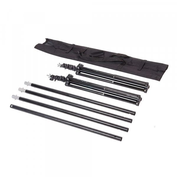 Горизонтальная перекладина — составная. Максимальная длина — 302 см. Состоит из четырёх алюминиевых секций-трубок (Ø 25 мм) с подпружиненными фиксаторами. При необходимости — можно использовать две крайние секции, тогда длина штанги будет составлять 151 см. Установка фона без кармана для крепления производится при помощи зажимов (в комплект не входят).