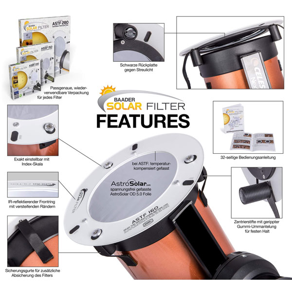 Защитная пленка AstroSolar™ фирмы Baader Planetarium представляет собой специально изготовленную фольгу толщиной 0,012 мм, свободную от прожилок и пузырьков, обладающую оптическим качеством плоскопараллельных стеклянных фильтров. Она изготавливается не на основе «лавсана». Равномерная молекулярная структура материала фольги является результатом исследований в области ядерной физики и физики элементарных частиц. При изготовлении пленки ее покрытие подвергается непрерывному контролю.