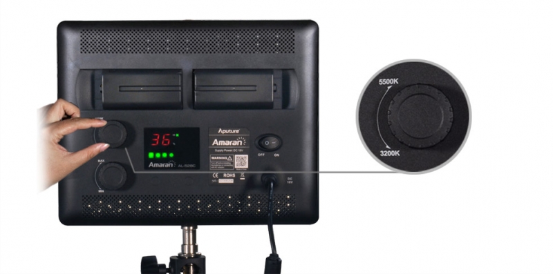 Плавная регулировка цветовой температуры. Amaran 528C содержит два вида ламп: белого цвета и оранжевого. Они позволяют контролировать цветовую температуру вращением колеса регулировки. Поворачивая кольцо вправо, температура цвета снижается от 5500К до 3200К.
