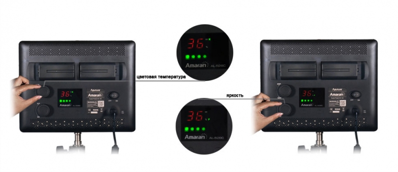 Цифровой дисплей состояния. ЖК дисплей показывает яркость и цветовую температуру, позволяя контролировать их более точно. Дисплей отображает состояние цветовой температуры от 32 до 55 и от 10% до 99% яркости.