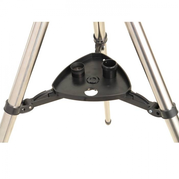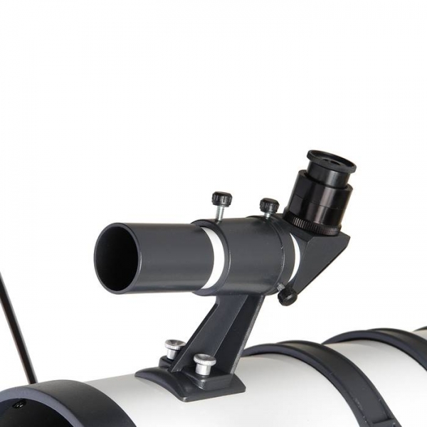 Телескоп Veber Polarstar 1000/114 EQ — оптимальная модель для серьезных, но начинающих любителей астрономии. Зеркало диаметром 114 мм достаточно велико, чтобы собирать много света (в этот телескоп вы сможете увидеть объекты солнечной системы во всех подробностях — таких как щель Кассини в кольце Сатурна, лунные кратеры размером ок.5 км, слабые звезды до 13 m зв. величины). Однако, габариты прибора вполне «домашние», длина трубы всего 42 см. С окуляром PL25 вы получите увеличение 40х, с которым удобно вести наземные наблюдения. При этом ближняя точка фокусировки составит всего 12 м. Очень стильное исполнение телескопа: белая глянцевая металлическая труба в обрамлении выглядящих брутально крышек, металлическая монтировка с декоративными оранжевыми элементами, мощный штатив из полированной нержавейки… Удобный 90 градусный искатель (увеличение 6х) расположен рядом с окуляром. Прибор оснащен монтировкой немецкого типа EQ5 с возможностью подключения электропривода (для постоянного наблюдения за выбранным объектом). Многие другие фирмы, в целях удешевления, устанавливают такие телескопы на монтировку EQ1, которая является для них откровенно слабой. Вся конструкция:телескоп-монтировка-штатив должна быть достаточно жесткой и гасить дрожания и колебания которые мешают наблюдениям. В данном телескопе стальной штатив имеет еще и дополнительные распорки, на которые устанавливается столик для аксессуаров.