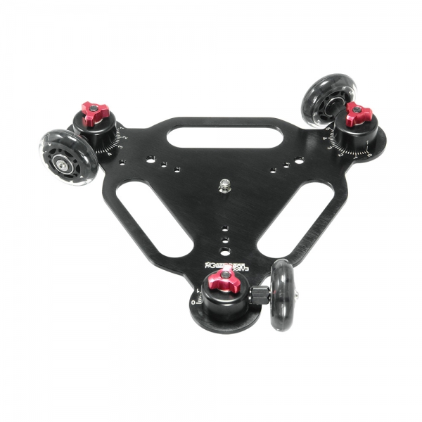 Шарикоподшипники из нержавеющей стали внутри колес обеспечивают плавное движение. Колеса затягиваются, ослабляются и могут быть сняты, также их можно установить в требуемые согласованные положения в соответствии с маркировкой по шкале вокруг каждого колеса. Каждое колесо имеет свой номер (1, 2, 3), это поможет легко вернуться к нужной траектории после перерыва в съемках. Ручки и маркировка удобно расположены на верхней поверхности, а не на нижней или боковой стороне тележки. Толщина платформы 5 мм, три выреза на платформе обеспечивают удобное маневрирование и служат ручками для переноски. Камера может быть прикреплена непосредственно к винту 1/4 дюйма в центре тележки, а для крепления штативной головки прилагается адаптер 1/4" – 3/8". Дополнительные отверстия с резьбой 1/4" и 3/8" на каждом из трех углов позволяют устанавливать шарнирные держатели с подсветкой, микрофонами и другими аксессуарами. Особенностью 3-колесной тележки по сравнению с 4-колесной тележкой является дополнительная возможность достижения 360° проводок вокруг оси камеры.