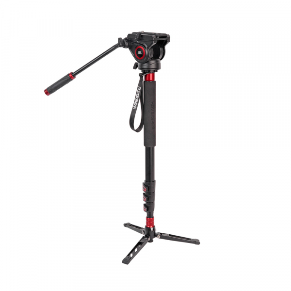 Четыре секции из алюминиевого сплава с надёжными и эргономичными клипсовыми зажимами из ABS пластика — при поспешном «отщёлкивании» клипс оператор не травмирует пальцы отскочившим зажимным язычком. Диаметр секций — 33 / 29 / 26 / 22 мм. При ослаблении клипсового фиксатора — возможна регулировка усилия зажима гайкой под шестигранный ключ (идёт в комплекте). На верхней секции предусмотрены: накладка-рукав из вспененного материала для комфортного удержания монопода в холодное время года и кистевой ремень. На круглой площадка верхней базы монопода находится (реверсивный) винт 1/4″ — 3/8″, на который крепится видеоголовка, а при необходимости непосредственно камера. Для выставления камеры по горизонту, в основании головки имеется пузырьковый уровень.