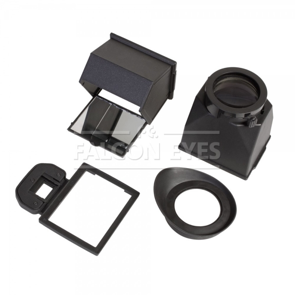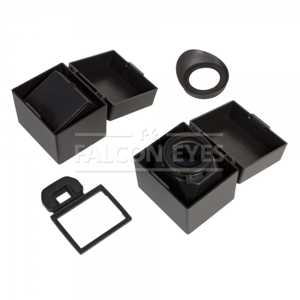 LCD-5D2 – набор видоискателей для ЖК монитора камеры Canon 5D II, состоящий из увеличивающего изображение окуляра с наглазником и углового видоискателя. Устройство позволяет вести съемку на открытом освещенном пространстве и предотвратить нежелательные засвечивания кадра и блики. Комплект находит широкое применение во всех сферах фотографии, где необходима удобная работа с ЖК монитором камеры – макросъемка, предметная съемка, видеосъемка и т.д. Насадки из набора Falcon Eyes LCD-5D2 устанавливаются на монтажную рамку, которая крепится к оптическому видоискателю камеры. Первая насадка представляет собой видоискатель с 3х кратной линзой и резиновым наглазником, блокирует нежелательные блики от внешнего освещения и увеличивает изображение, данная насадка часто используется в системах стабилизации на основе рига. На окуляре насадки находится кольцо диоптрийной коррекции, это поможет настроить изображение под индивидуальные особенности зрения. Второй насадкой является угловой видоискатель ЖК монитора. С помощью системы зеркал позволяет повернуть изображение под углом 90˚ и увидеть отражение ЖК-монитора непосредственно над камерой. Это удобно при макросъемке, съемке с крайних нижних точек (когда трудно получить доступ к экрану низко расположенного фотоаппарата) и съемке событий происходящих сверху - птицы в полете, самолеты, парашютисты и т.д. В комплекте два пластиковых футляра для хранения комплекта.